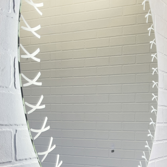 Зеркальное высококачественное полотно с амальгамой на основе серебра. Круглое зеркало для ванной по периметру украшено орнаментом. Зеркало оборудовано ореольной и фронтальной LED подсветкой бесконтактным выключателем со встроенной функцией регулировки яркости. Температура подсветки 6000-6500K холодный свет.