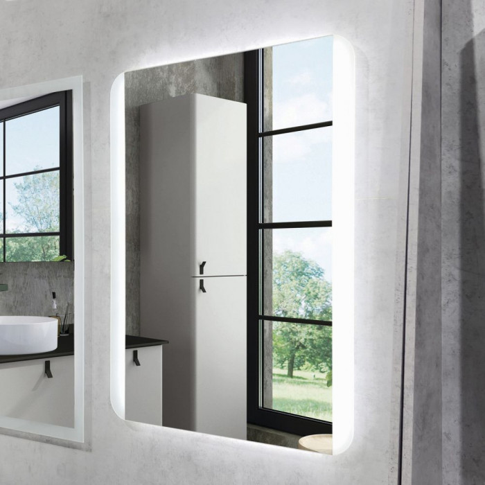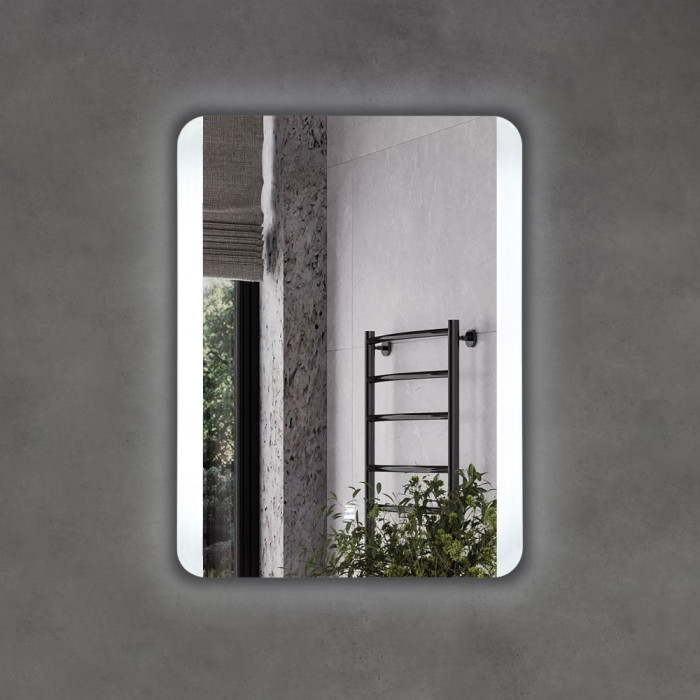Прямоугольное зеркало для ванной комнаты с закругленными углами. Высококачественное зеркальное полотно с амальгамой на основе серебра. Зеркало оборудовано ореольной и линейной боковой Led подсветкой с бесконтактным включателем со встроенной функцией регулировки яркости. Температура подсветки: 6000-6500К холодная.