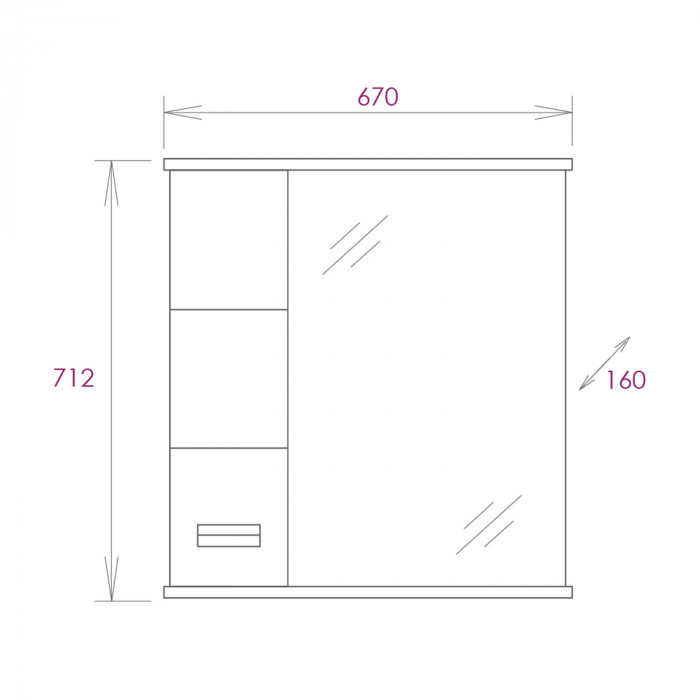 Слева от зеркала за распашной дверцей с механизмом плавного закрывания расположено отделение для хранения, разделенное на две части горизонтальной полочкой, под зеркалом - открытая полочка для косметических средств или декоративных элементов.