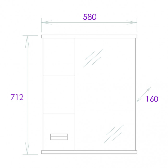 Слева от зеркала за распашной дверцей с механизмом плавного закрывания расположено отделение для хранения, разделенное на две части горизонтальной полочкой, под зеркалом - открытая полочка для косметических средств или декоративных элементов.