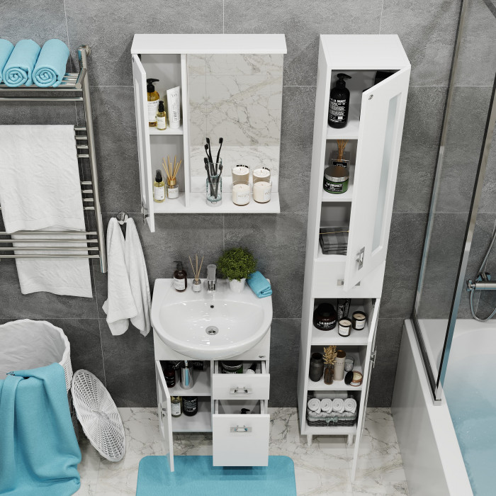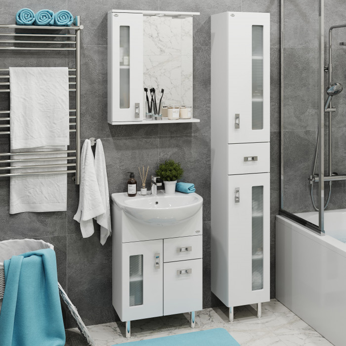 Белоснежный цвет фасада в сочетании со вставками из матового стекла и хромированными ручками необычной формы придадут ванной комнате ощущение свежести, чистоты и уюта.