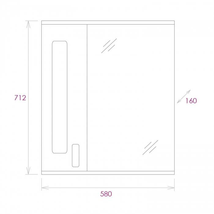 Слева от зеркала за распашной дверцей с механизмом плавного закрывания расположено отделение для хранения, разделенное полкой, под зеркалом - открытая полочка для косметических средств или декоративных элементов.