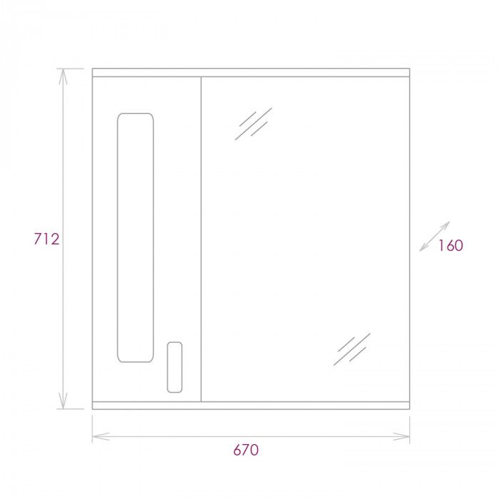 Слева от зеркала за распашной дверцей с механизмом плавного закрывания расположено отделение для хранения, разделенное полкой, под зеркалом - открытая полочка для косметических средств или декоративных элементов.