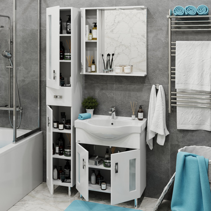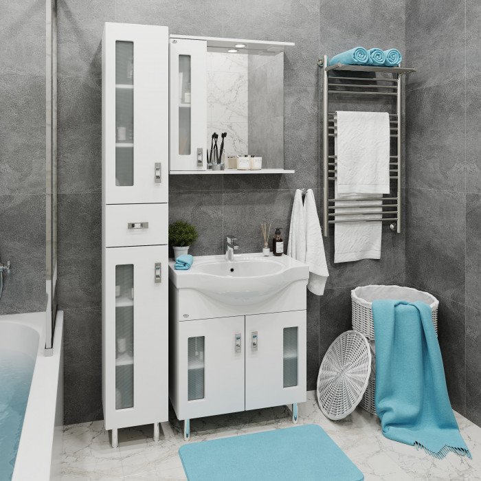 Белоснежный цвет фасада в сочетании со вставками из матового стекла и хромированными ручками необычной формы придадут ванной комнате ощущение свежести, чистоты и уюта.