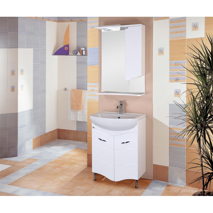 Справа от зеркала за распашной фигурной дверцей с изящной фрезеровкой и механизмом плавного закрывания расположено отделение для хранения, разделенное на две части горизонтальной полочкой, под зеркалом - открытая полочка для косметических средств или декоративных элементов.