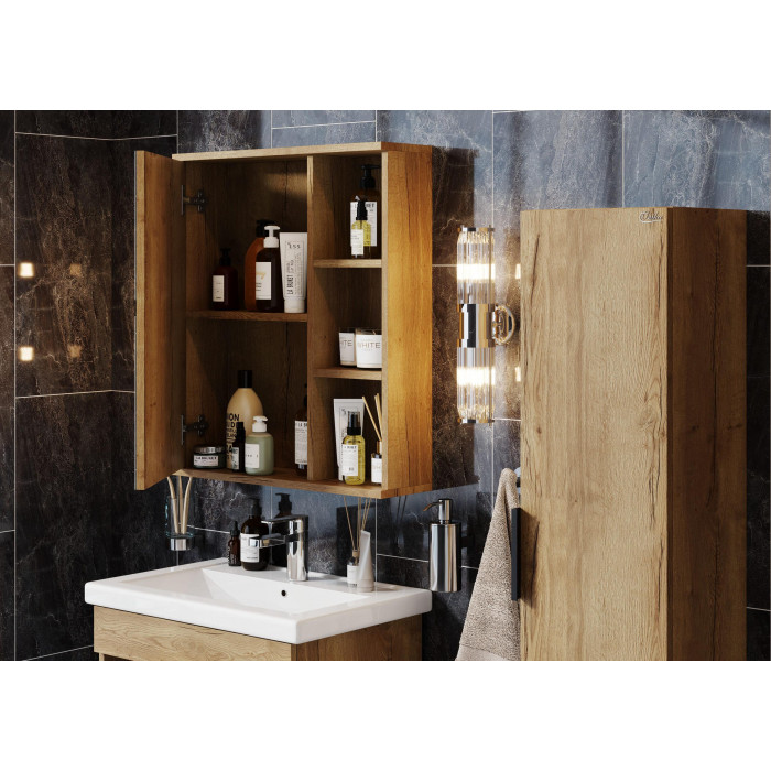 Открытые полки обеспечивают быстрый доступ к часто используемым аксессуарам, а пространство за распашной зеркальной дверцей с механизмом плавного закрывания, разделенное полочкой, станет удобным местом для хранения различных бытовых принадлежностей.