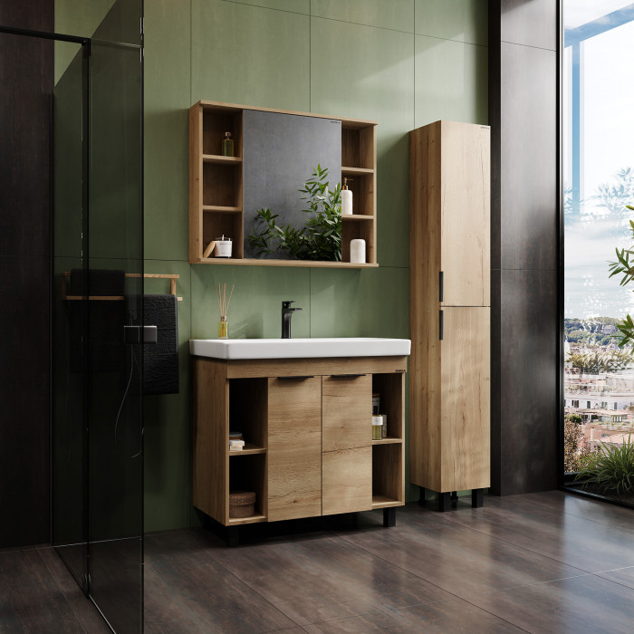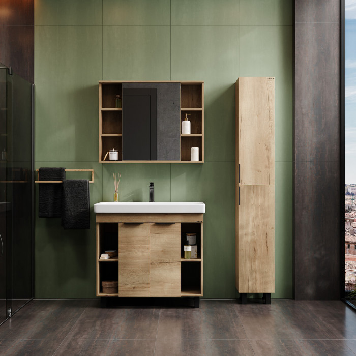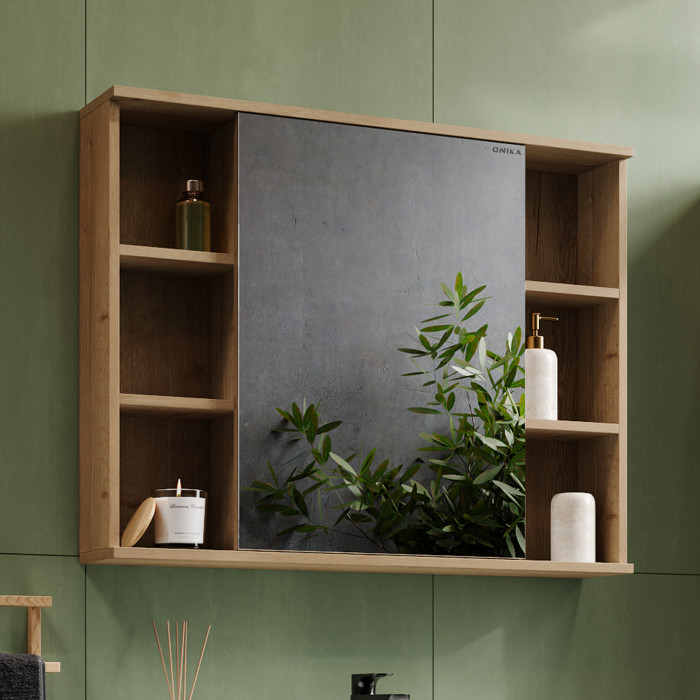 Открытые полки по бокам обеспечивают быстрый доступ к часто используемым аксессуарам, а пространство за распашной зеркальной дверцей с доводчиком, разделенное полочкой, станет удобным местом для хранения различных бытовых принадлежностей.