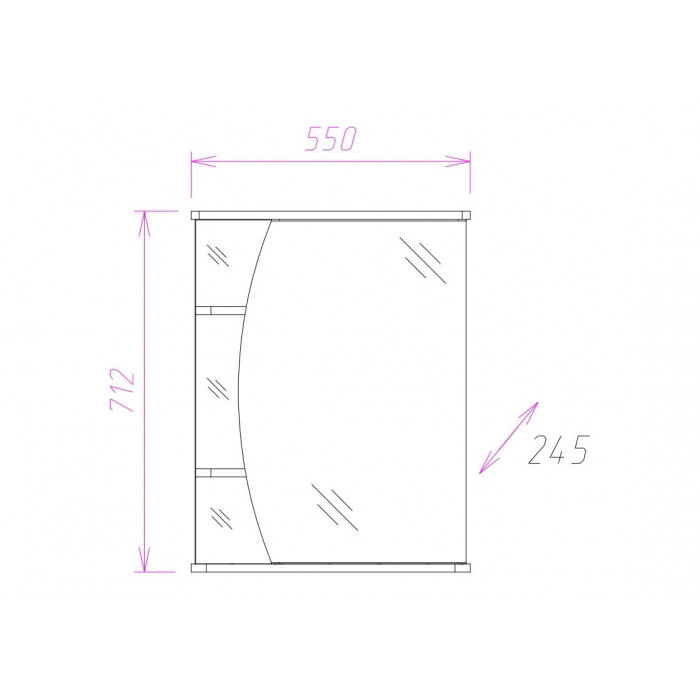 Слева за распашной зеркальной дверцей с механизмом плавного закрывания расположено вместительное отделение для хранения, разделенное на 3 части горизонтальными полочками, справа - 3 открытые полочки для косметических средств или декоративных элементов.