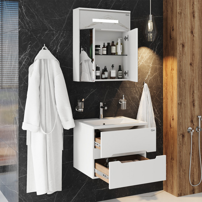 Внешне это отражается в лаконичной прямоугольной форме без ручек и лишнего декора и стильной подсветке, в функционально - в двух дверцах разного размера с механизмом плавного закрывания, скрывающих просторное пространство для хранения необходимых вещей, разделенное на 2 части стеклянной полочкой с еврокромкой.