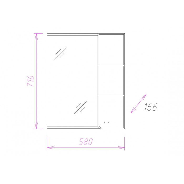Справа от зеркала за распашной дверцей с неброской горизонтальной фрезеровкой и механизмом плавного закрывания, расположено отделение для хранения, разделенное полкой. Под зеркалом - открытая полочка для косметических средств или декоративных элементов.