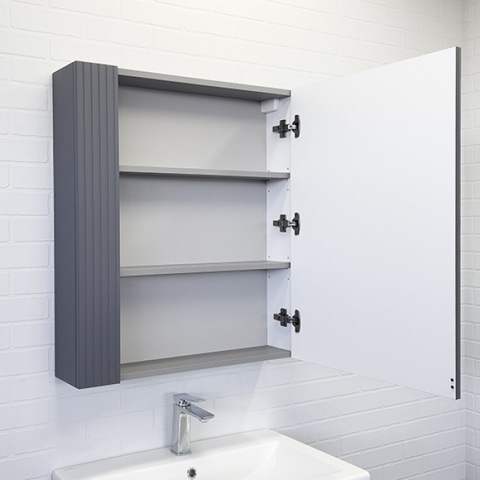 Зеркальное высококачественное полотно с амальгамой на основе серебра. Створка декорирована вертикальной фрезеровкой и оснащена петлями плавного закрывания. За створкой две полки. В модели применяется плёнка с эффектом Soft-Touch.