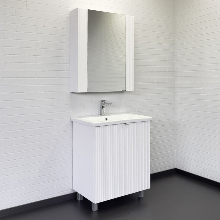 Зеркальное высококачественное полотно с амальгамой на основе серебра. Створка декорирована вертикальной фрезеровкой и оснащена петлями плавного закрывания. За створкой две полки. В модели применяется плёнка с эффектом Soft-Touch.
