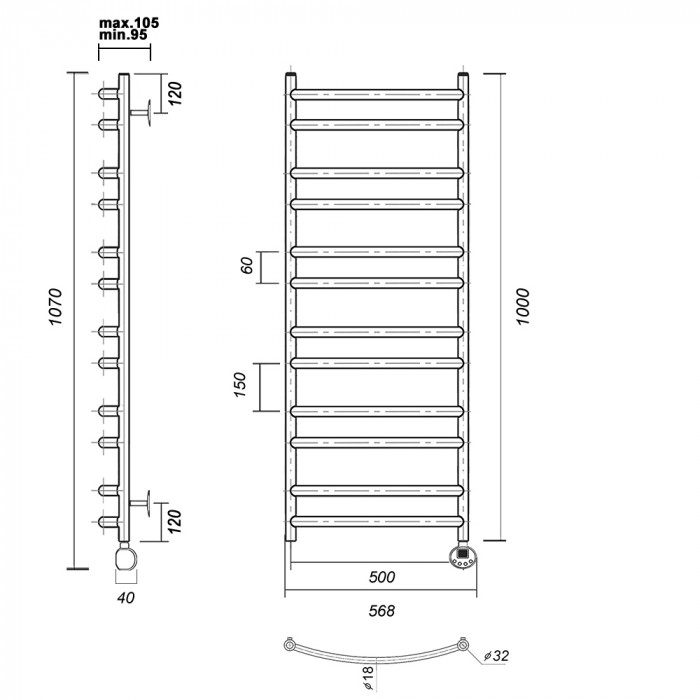 Полотенцесушитель электрический Domoterm Калипсо Калипсо П12 500x1000 ER Хром 2-2-2-2-2-2 Тэн справа тэн стойка крепления - 4 шт., кран Маевского 1 шт., заглушка -1 шт. Тэн с цифровым терморегулятором полотенцесушители настенные Россия 2 года