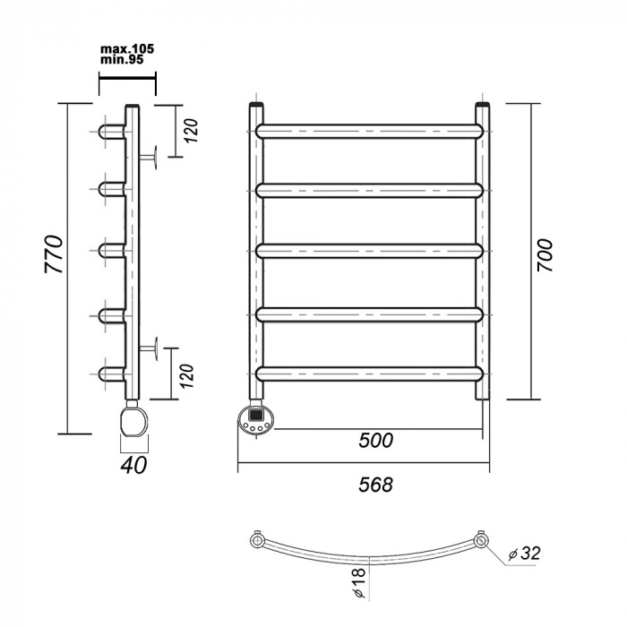 Полотенцесушитель электрический Domoterm Калипсо Калипсо П5 500x700 EL Хром равноудаленная Тэн слева тэн стойка крепления - 4 шт., кран Маевского 1 шт., заглушка -1 шт. Тэн с цифровым терморегулятором полотенцесушители настенные Россия 2 года