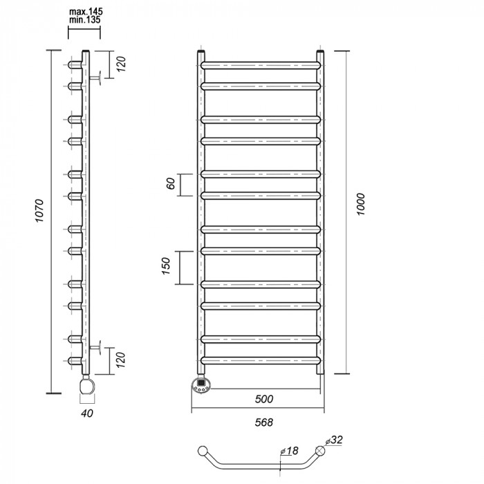 Полотенцесушитель электрический Domoterm Лаура Лаура П12 500x1000 EL Хром 2-2-2-2-2-2 Тэн слева тэн стойка крепления - 4 шт., кран Маевского 1 шт., заглушка -1 шт. Тэн с цифровым терморегулятором полотенцесушители настенные Россия 2 года