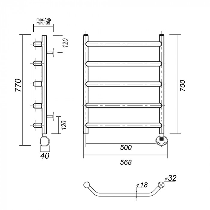 Полотенцесушитель электрический Domoterm Лаура Лаура П5 500x700 ER Хром равноудаленная Тэн справа тэн стойка крепления - 4 шт., кран Маевского 1 шт., заглушка -1 шт. Тэн с цифровым терморегулятором полотенцесушители настенные Россия 2 года
