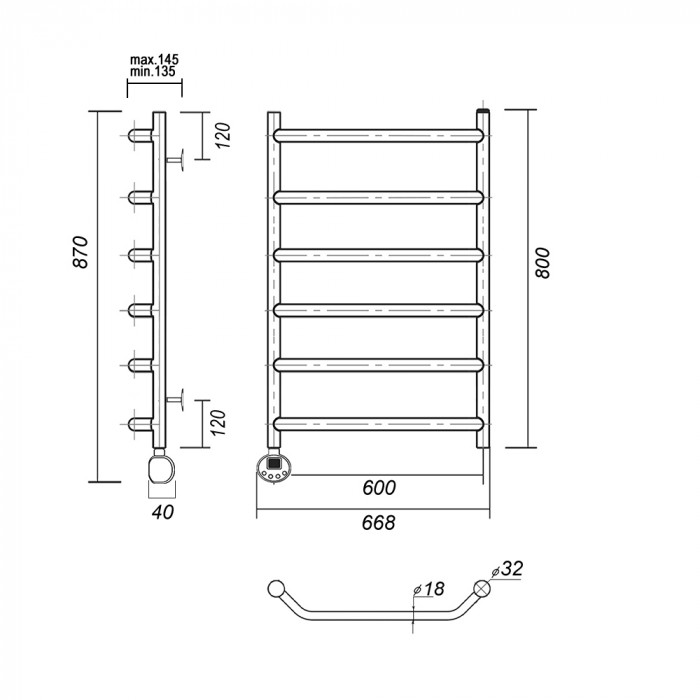 Полотенцесушитель электрический Domoterm Лаура Лаура П6 600x800 EL Хром равноудаленная Тэн слева тэн стойка крепления - 4 шт., кран Маевского 1 шт., заглушка -1 шт. Тэн с цифровым терморегулятором полотенцесушители настенные Россия 2 года