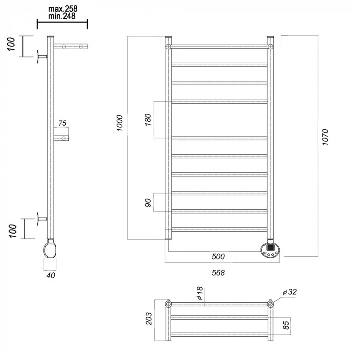 Полотенцесушитель электрический Domoterm Медея с 2 полками Медея сп2 П10 500x1000 ER Хром 1-3-1-5 Тэн справа тэн стойка крепления - 4 шт., кран Маевского 1 шт., заглушка -1 шт. Тэн с цифровым терморегулятором полотенцесушители настенные Россия 2 года