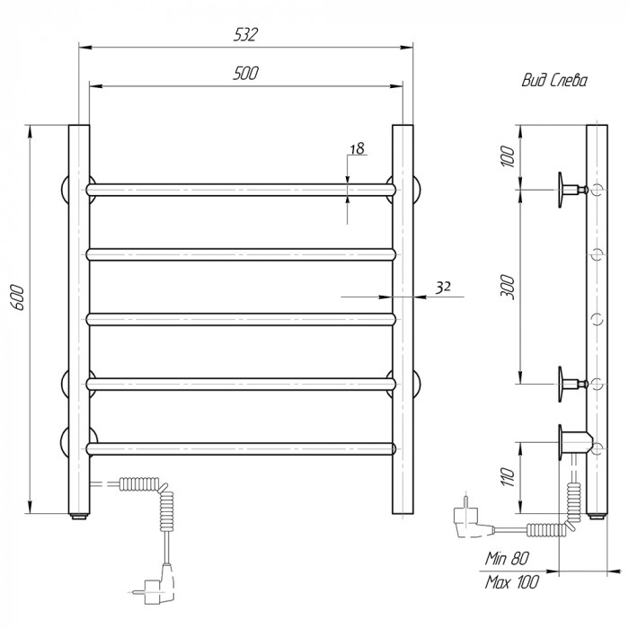 Полотенцесушитель элктрический Domoterm Аврора DMT 109-5 50x60 EK L Хром подключение слева сухой греющий кабель стойка крепления - 4 шт. нержавеющая сталь лесенка Россия 2 года