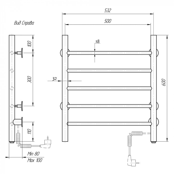 Полотенцесушитель элктрический Domoterm Аврора DMT 109-5 50x60 EK R Хром подключение справа сухой греющий кабель стойка крепления - 4 шт. нержавеющая сталь лесенка Россия 2 года