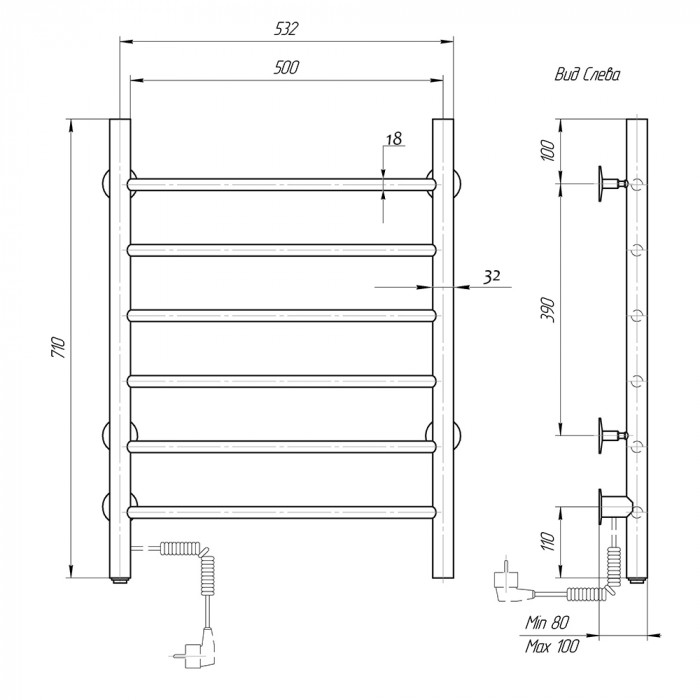 Полотенцесушитель элктрический Domoterm Аврора DMT 109-6 50x71 EK L Хром подключение слева сухой греющий кабель стойка крепления - 4 шт. нержавеющая сталь лесенка Россия 2 года