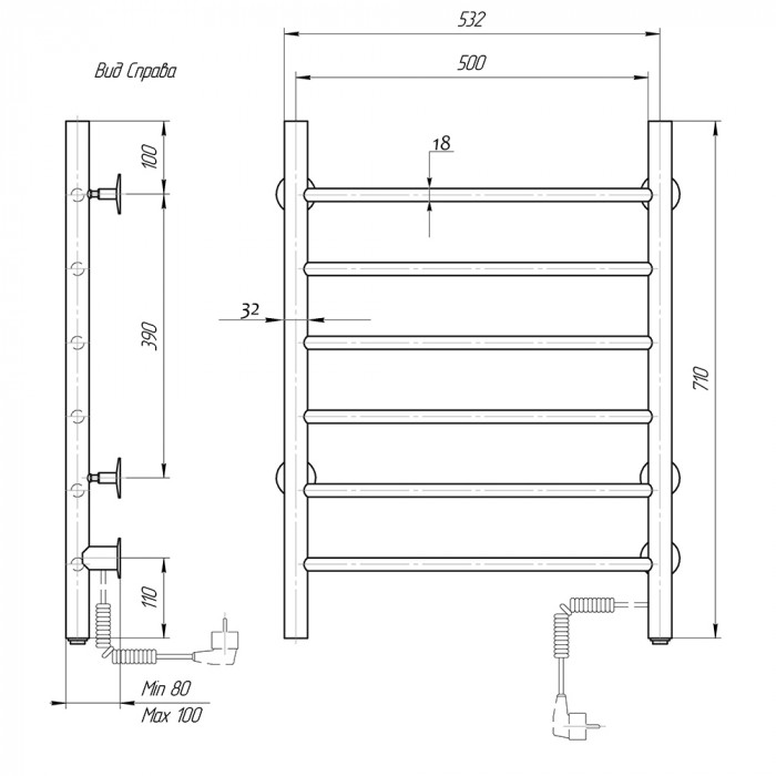 Полотенцесушитель элктрический Domoterm Аврора DMT 109-6 50x71 EK R Хром подключение справа сухой греющий кабель стойка крепления - 4 шт. нержавеющая сталь лесенка Россия 2 года