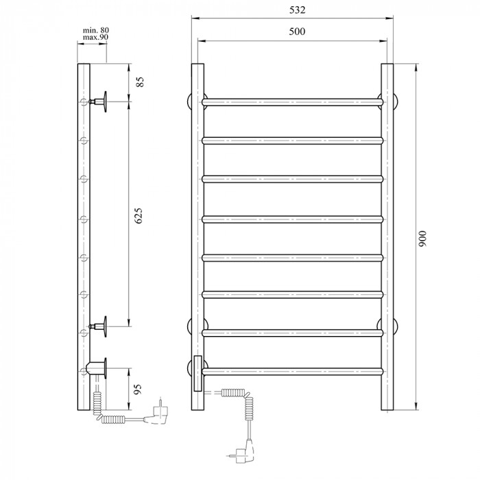 Полотенцесушитель элктрический Domoterm Аврора DMT 109-8 50x90 EKTD L Хром подключение слева сухой греющий кабель стойка крепления - 4 шт. нержавеющая сталь лесенка Россия 2 года