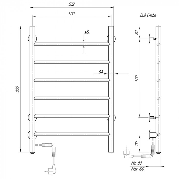 Полотенцесушитель элктрический Domoterm Классик DMT 109-6 50x80 EK L Хром подключение слева сухой греющий кабель стойка крепления - 4 шт. нержавеющая сталь лесенка Россия 2 года