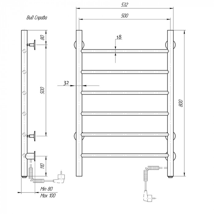 Полотенцесушитель элктрический Domoterm Классик DMT 109-6 50x80 EK R Хром подключение справа сухой греющий кабель стойка крепления - 4 шт. нержавеющая сталь лесенка Россия 2 года