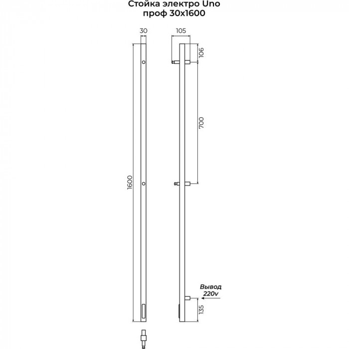 Стойка электро TERMINUS UNO проф 1600 крашеный, RAL 9005 муар 4670078557759 VEM конструкционная сталь 30х30 2 года Теплоотдача, Вт 91 sensor quick touch