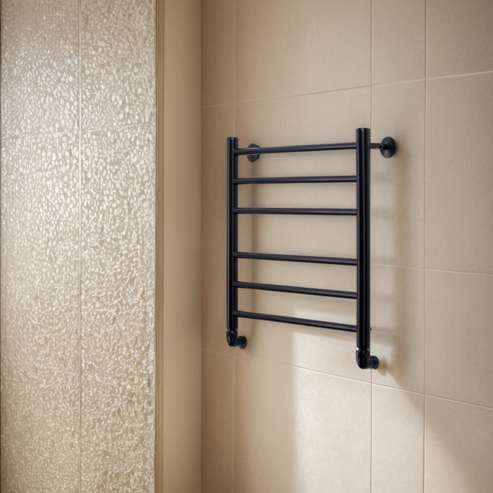 Полотенцесушитель водяной Comfysan Luce W-6 60/50, черный 013387 Межосевое расстояние (см) 50 Лесенка окрашенное Черный матовый По выбору: нижнее, боковое, диагональное Водяной Россия Полотенцесушитель водяной Comfysan Luce W-6 60/50, черный
