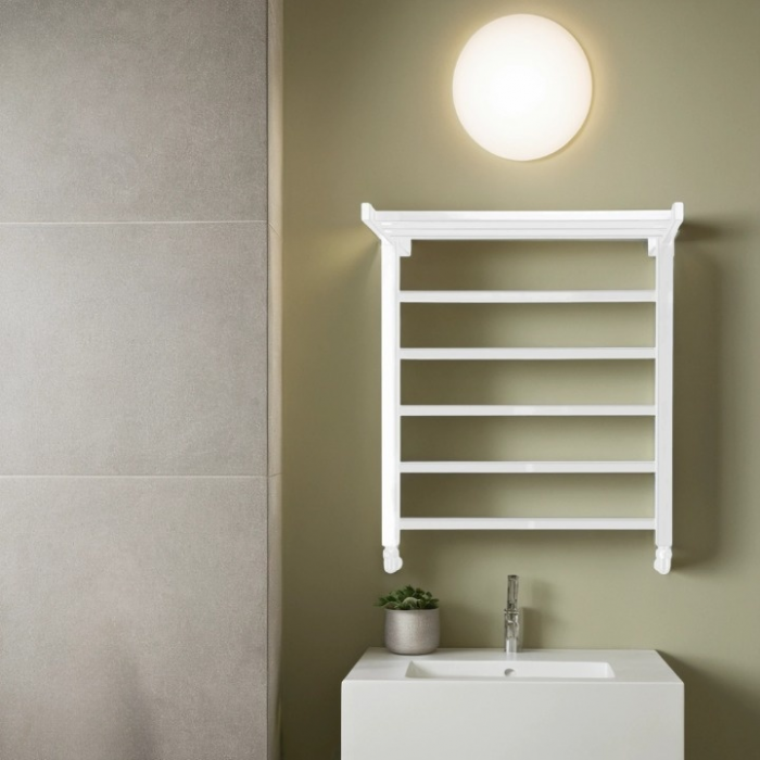 Полотенцесушитель водяной Comfysan Marte-K W-6 60/50 с полкой, белый 012533 Межосевое расстояние (см) 50 Лесенка окрашенное Белый матовый По выбору: нижнее, боковое, диагональное Водяной Россия Полотенцесушитель водяной Comfysan Marte-K W-6 60/50 с полкой, белый