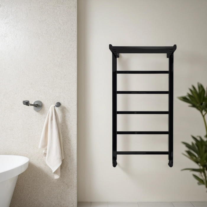 Полотенцесушитель водяной Comfysan Marte-K W-6 80/40 с полкой, черный 012601 Межосевое расстояние (см) 40 Лесенка окрашенное Черный матовый По выбору: нижнее, боковое, диагональное Водяной Россия Полотенцесушитель водяной Comfysan Marte-K W-6 80/40 с полкой, черный
