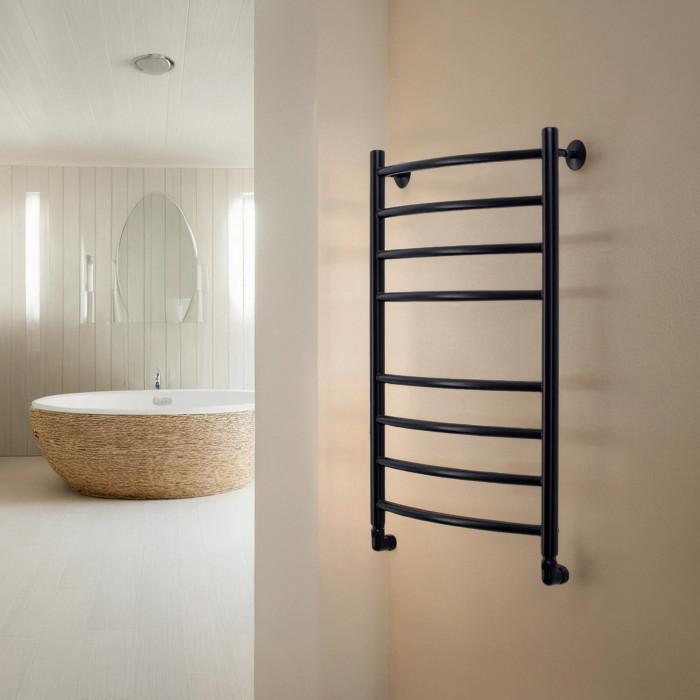 Полотенцесушитель водяной Comfysan Noumi W-8 80/40, черный 013806 Межосевое расстояние (см) 40 Лесенка окрашенное Черный матовый По выбору: нижнее, боковое, диагональное Водяной Россия Полотенцесушитель водяной Comfysan Noumi W-8 80/40, черный