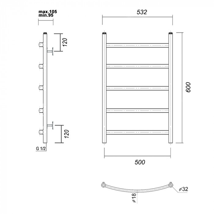 Полотенцесушитель водяной Domoterm Калипсо Калипсо П5 500x600 Хром равноудаленная нижнее 1/2" ВР (внутренняя резьба) стойка крепления - 4 шт., переходник угловой 1/2х3/4 - 2 шт., кран Маевского 1 шт., заглушка -1 шт. полотенцесушители настенные Россия 5 лет