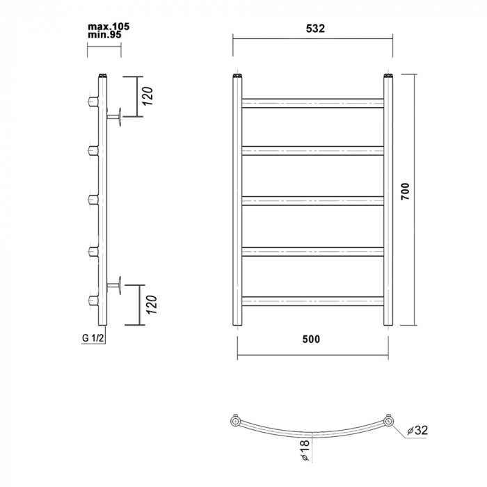 Полотенцесушитель водяной Domoterm Калипсо Калипсо П5 500x700 Хром равноудаленная нижнее 1/2" ВР (внутренняя резьба) стойка крепления - 4 шт., переходник угловой 1/2х3/4 - 2 шт., кран Маевского 1 шт., заглушка -1 шт. полотенцесушители настенные Россия 5 лет