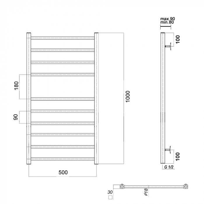 Полотенцесушитель водяной Domoterm Куба Куба П10 500х1000 Хром 4-6 нижнее 1/2" ВР (внутренняя резьба) стойка крепления - 4 шт., переходник угловой 1/2х3/4 - 2 шт., кран Маевского 1 шт., заглушка -1 шт. Россия 5 лет