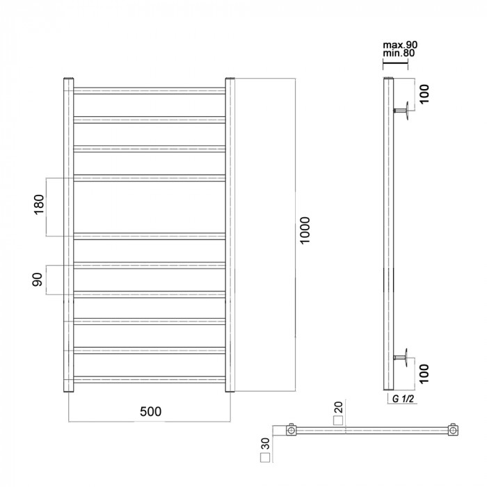Полотенцесушитель водяной Domoterm Квадро Квадро П10 500х1000 Хром 4-6 нижнее 1/2" ВР (внутренняя резьба) стойка крепления - 4 шт., переходник угловой 1/2х3/4 - 2 шт., кран Маевского 1 шт., заглушка -1 шт. Россия 5 лет