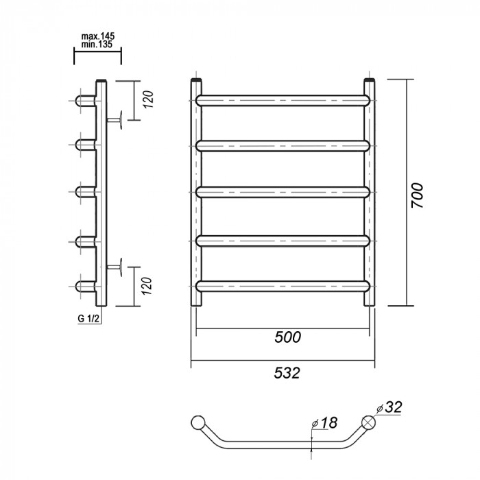 Полотенцесушитель водяной Domoterm Лаура Лаура П5 500x700 Хром равноудаленная нижнее 1/2" ВР (внутренняя резьба) стойка крепления - 4 шт., переходник угловой 1/2х3/4 - 2 шт., кран Маевского 1 шт., заглушка -1 шт. полотенцесушители настенные Россия 5 лет