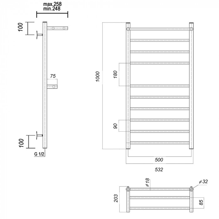 Полотенцесушитель водяной Domoterm Медея с 2 полками Медея сп2 П10 500x1000 Хром 1-3-1-5 нижнее 1/2" ВР (внутренняя резьба) стойка крепления - 4 шт., переходник угловой 1/2х3/4 - 2 шт., кран Маевского 1 шт., заглушка -1 шт. полотенцесушители настенные Россия 5 лет