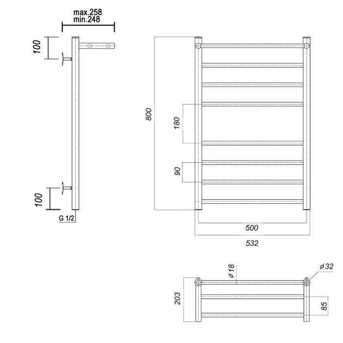 Полотенцесушитель водяной Domoterm Медея с полкой Медея сп П8 500х800 Хром 1-3-4 нижнее 1/2" ВР (внутренняя резьба) стойка крепления - 4 шт., переходник угловой 1/2х3/4 - 2 шт., кран Маевского 1 шт., заглушка -1 шт. полотенцесушители настенные Россия 5 лет