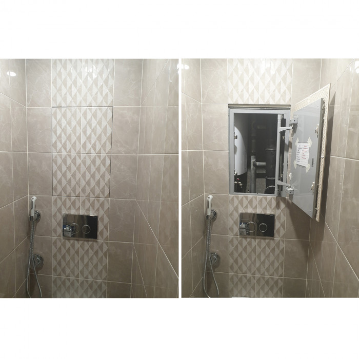 Люк под плитку Хаммер Стил 40/50 (ш/в, размер дверцы 375/475, гл.45) Ревизионный люк Алюминий Шестигранный (торцевой) ключ – 1 шт, рожковый ключ – 1 шт, дюбель – 4 шт, саморез – 4шт, заглушки – Россия Люк под плитку Хаммер Стил 40/50 (ш/в, размер дверцы 375/475, гл.45) Люк модели (СТИЛ) (размер дверцы 375/475) предназначен для скрытой ревизии инженерных коммуникаций и проемов с последующей облицовкой керамической плиткой. Люк открывается и закрывается легким нажатием на дверцу, не прибегая к помощи дополнительных приспособлений. Монтаж люка прост и не требует подрезки плитки в зоне люка, т.к. имеется возможность оклеивания дверцы отделочным материалом внахлест. Возможен монтаж люка в стены из гипсокартона, пеноблока, кирпича и т.д. Люк имеет инновационную запатентованную 3D регулировку. Жесткость стальной конструкции колоссально увеличивает ресурс изделия.