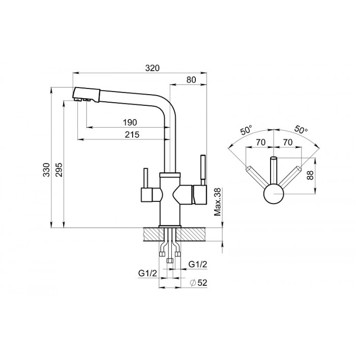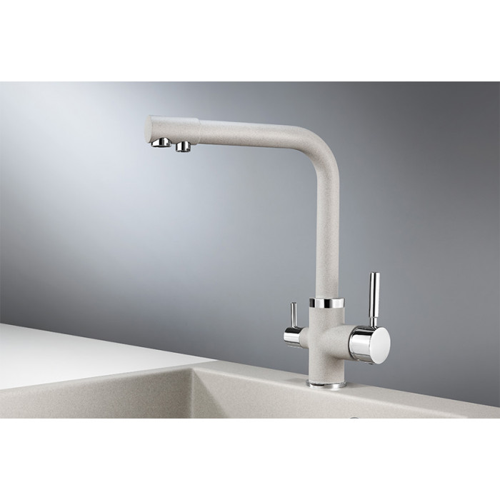 Смеситель для кухни GRANULA 2015, БАЗАЛЬТ Смеситель для кухонной мойки Granula 2015 изготовлен из высококачественного материала. Латунный корпус обеспечивает длительный срок службы. При этом высокий излив позволяет мыть как мелкую, так и крупногабаритную посуду. Двухрычажная модель смесителя Granula 2015 выполнена с краном для питьевой воды. Фильтрованная вода подается по отдельной трубке и не смешивается с водопроводной водой. Покупателям предлагаются различные типы смесителей, окрашенные в тон моек Granula и StandART. Все модели смесителей для кухонных моек во всех цветах Вы можете посмотреть и приобрести на нашем сайте или в наших представительствах в регионах.Если у Вас остались вопросы, обращайтесь к нашим консультантам Высокий Двухрычажный Хром Латунь 365x275x60 РОССИЯ Корпус 5 лет, покрытие 2 года, картридж 1 год, резиновые прокладки 6 мес., гибкая подводка 6 мес. Гибкая подводка, комплект креплений, переходник для подключения фильтра с питьевой водой