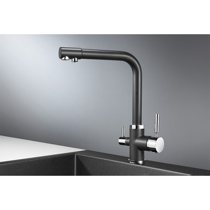 Смеситель для кухни GRANULA 2015, ЧЁРНЫЙ Смеситель для кухонной мойки Granula 2015 изготовлен из высококачественного материала. Латунный корпус обеспечивает длительный срок службы. При этом высокий излив позволяет мыть как мелкую, так и крупногабаритную посуду. Двухрычажная модель смесителя Granula 2015 выполнена с краном для питьевой воды. Фильтрованная вода подается по отдельной трубке и не смешивается с водопроводной водой. Покупателям предлагаются различные типы смесителей, окрашенные в тон моек Granula и StandART. Все модели смесителей для кухонных моек во всех цветах Вы можете посмотреть и приобрести на нашем сайте или в наших представительствах в регионах.Если у Вас остались вопросы, обращайтесь к нашим консультантам Высокий Двухрычажный Хром Латунь 365x275x60 РОССИЯ Корпус 5 лет, покрытие 2 года, картридж 1 год, резиновые прокладки 6 мес., гибкая подводка 6 мес. Гибкая подводка, комплект креплений, переходник для подключения фильтра с питьевой водой