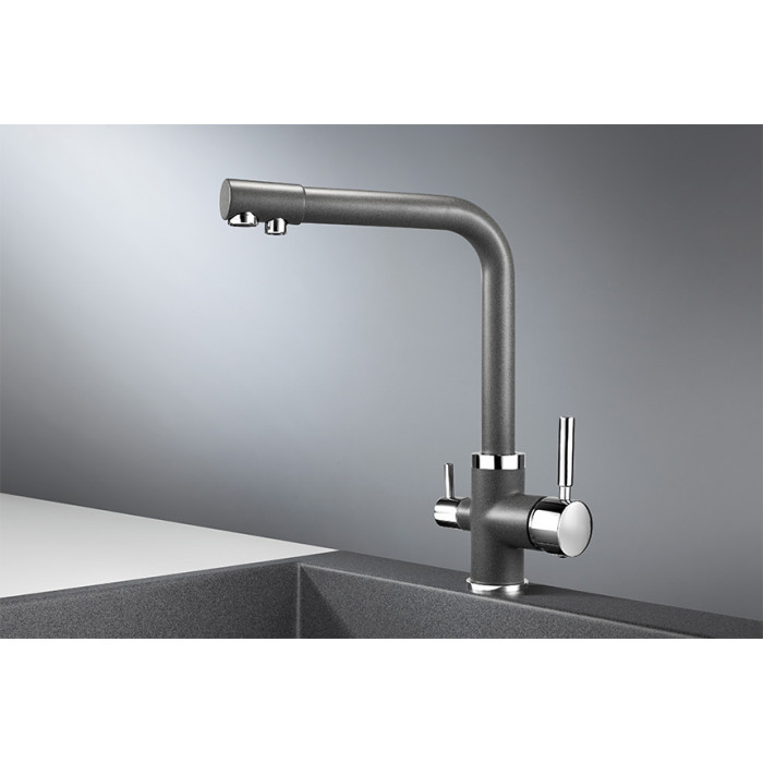 Смеситель для кухни GRANULA 2015, ГРАФИТ (ЧЁРНО-СЕРЫЙ) Смеситель для кухонной мойки Granula 2015 изготовлен из высококачественного материала. Латунный корпус обеспечивает длительный срок службы. При этом высокий излив позволяет мыть как мелкую, так и крупногабаритную посуду. Двухрычажная модель смесителя Granula 2015 выполнена с краном для питьевой воды. Фильтрованная вода подается по отдельной трубке и не смешивается с водопроводной водой. Покупателям предлагаются различные типы смесителей, окрашенные в тон моек Granula и StandART. Все модели смесителей для кухонных моек во всех цветах Вы можете посмотреть и приобрести на нашем сайте или в наших представительствах в регионах.Если у Вас остались вопросы, обращайтесь к нашим консультантам Высокий Двухрычажный Хром Латунь 365x275x60 РОССИЯ Корпус 5 лет, покрытие 2 года, картридж 1 год, резиновые прокладки 6 мес., гибкая подводка 6 мес. Гибкая подводка, комплект креплений, переходник для подключения фильтра с питьевой водой