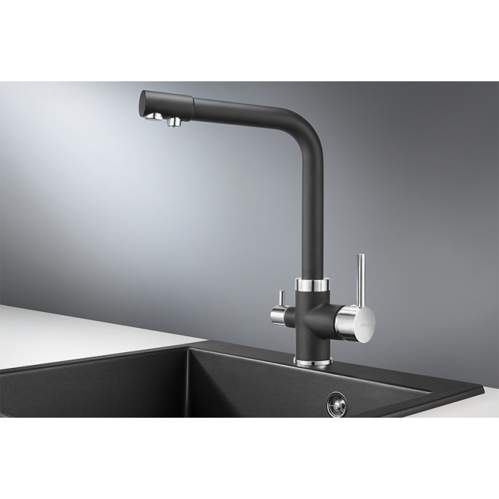 Смеситель для кухни GRANULA 2015, ТУРМАЛИН Смеситель для кухонной мойки Granula 2015 изготовлен из высококачественного материала. Латунный корпус обеспечивает длительный срок службы. При этом высокий излив позволяет мыть как мелкую, так и крупногабаритную посуду. Двухрычажная модель смесителя Granula 2015 выполнена с краном для питьевой воды. Фильтрованная вода подается по отдельной трубке и не смешивается с водопроводной водой. Покупателям предлагаются различные типы смесителей, окрашенные в тон моек Granula и StandART. Все модели смесителей для кухонных моек во всех цветах Вы можете посмотреть и приобрести на нашем сайте или в наших представительствах в регионах.Если у Вас остались вопросы, обращайтесь к нашим консультантам Высокий Двухрычажный Хром Латунь 365x275x60 РОССИЯ Корпус 5 лет, покрытие 2 года, картридж 1 год, резиновые прокладки 6 мес., гибкая подводка 6 мес. Гибкая подводка, комплект креплений, переходник для подключения фильтра с питьевой водой