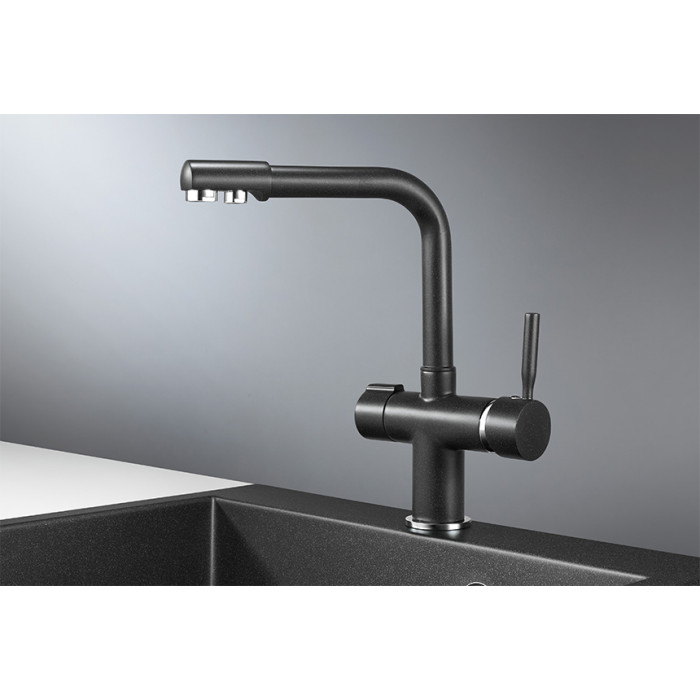 Смеситель для кухни GRANULA 2088, ЧЁРНЫЙ Смеситель для кухонной мойки Granula 2088 изготовлен из высококачественного материала. Латунный корпус обеспечивает длительный срок службы. При этом высокий излив позволяет мыть как мелкую, так и крупногабаритную посуду. Двухрычажная модель смесителя Granula 2088 выполнена с краном для питьевой воды. Фильтрованная вода подается по отдельной трубке и не смешивается с водопроводной водой. Покупателям предлагаются различные типы смесителей, окрашенные в тон моек Granula и StandART.Все модели смесителей для кухонных моек во всех цветах Вы можете посмотреть и приобрести на нашем сайте или в наших представительствах в регионах.Если у Вас остались вопросы, обращайтесь к нашим консультантам Высокий Двухрычажный Хром Латунь 365х275х60 РОССИЯ Корпус 5 лет, покрытие 2 года, картридж 1 год, резиновые прокладки 6 мес., гибкая подводка 6 мес. Гибкая подводка, комплект креплений, переходник для подключения фильтра с питьевой водой