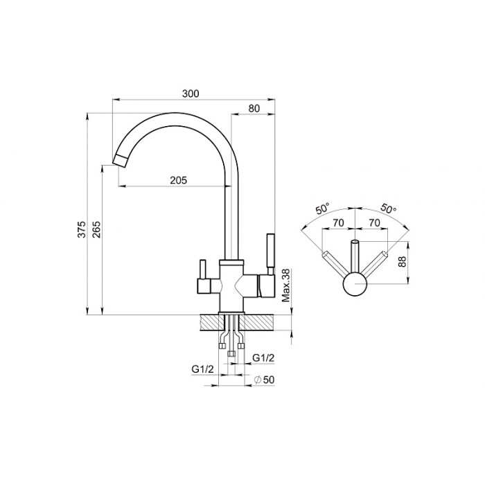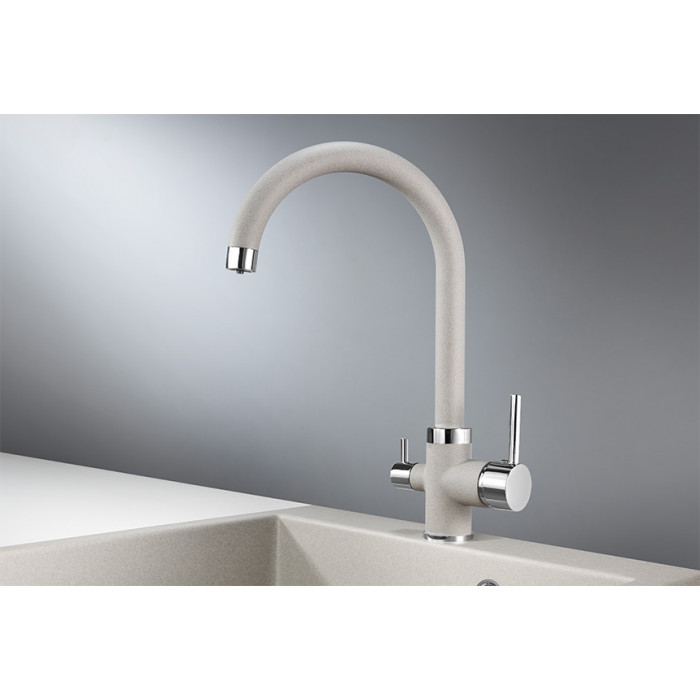Смеситель для кухни GRANULA 2168, БАЗАЛЬТ Смеситель для кухонной мойки Granula 2168 изготовлен из высококачественного материала. Латунный корпус обеспечивает длительный срок службы. При этом высокий излив позволяет мыть как мелкую, так и крупногабаритную посуду. Двухрычажная модель смесителя Granula 2168 выполнена с краном для питьевой воды. Фильтрованная вода подается по отдельной трубке и не смешивается с водопроводной водой. Покупателям предлагаются различные типы смесителей, окрашенные в тон моек Granula и StandART.Все модели смесителей для кухонных моек во всех цветах Вы можете посмотреть и приобрести на нашем сайте или в наших представительствах в регионах.Если у Вас остались вопросы, обращайтесь к нашим консультантам. Высокий Двухрычажный Хром Латунь 420*220*70 РОССИЯ Корпус 5 лет, покрытие 2 года, картридж 1 год, резиновые прокладки 6 мес., гибкая подводка 6 мес. Гибкая подводка, комплект креплений, переходник для подключения фильтра с питьевой водой