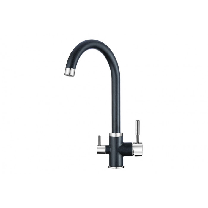 Смеситель для кухни GRANULA 2168, ШВАРЦ (чёрный металлик) Смеситель для кухонной мойки Granula 2168 изготовлен из высококачественного материала. Латунный корпус обеспечивает длительный срок службы. При этом высокий излив позволяет мыть как мелкую, так и крупногабаритную посуду. Двухрычажная модель смесителя Granula 2168 выполнена с краном для питьевой воды. Фильтрованная вода подается по отдельной трубке и не смешивается с водопроводной водой. Покупателям предлагаются различные типы смесителей, окрашенные в тон моек Granula и StandART.Все модели смесителей для кухонных моек во всех цветах Вы можете посмотреть и приобрести на нашем сайте или в наших представительствах в регионах.Если у Вас остались вопросы, обращайтесь к нашим консультантам. Высокий Двухрычажный Хром Латунь 420*220*70 РОССИЯ Корпус 5 лет, покрытие 2 года, картридж 1 год, резиновые прокладки 6 мес., гибкая подводка 6 мес. Гибкая подводка, комплект креплений, переходник для подключения фильтра с питьевой водой