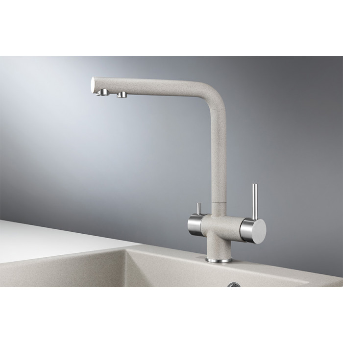 Смеситель для кухни GRANULA 2305, БАЗАЛЬТ Смеситель для кухонной мойки Granula 2305 изготовлен из высококачественного материала. Корпус из нержавеющей стали обеспечивает длительный срок службы. При этом высокий излив позволяет мыть как мелкую, так и крупногабаритную посуду. Двухрычажная модель смесителя Granula 2305 выполнена с краном для питьевой воды. Фильтрованная вода подается по отдельной трубке и не смешивается с водопроводной водой. Покупателям предлагаются различные типы смесителей, окрашенные в тон моек Granula и StandART. Все модели смесителей для кухонных моек во всех цветах Вы можете посмотреть и приобрести на нашем сайте или в наших представительствах в регионах.Если у Вас остались вопросы, обращайтесь к нашим консультантам. Высокий Двухрычажный Нержавеющая сталь Нержавеющая сталь 430x290x60 РОССИЯ Корпус 5 лет, покрытие 2 года, картридж 1 год, резиновые прокладки 6 мес., гибкая подводка 6 мес. Гибкая подводка, комплект креплений, переходник для подключения фильтра с питьевой водой